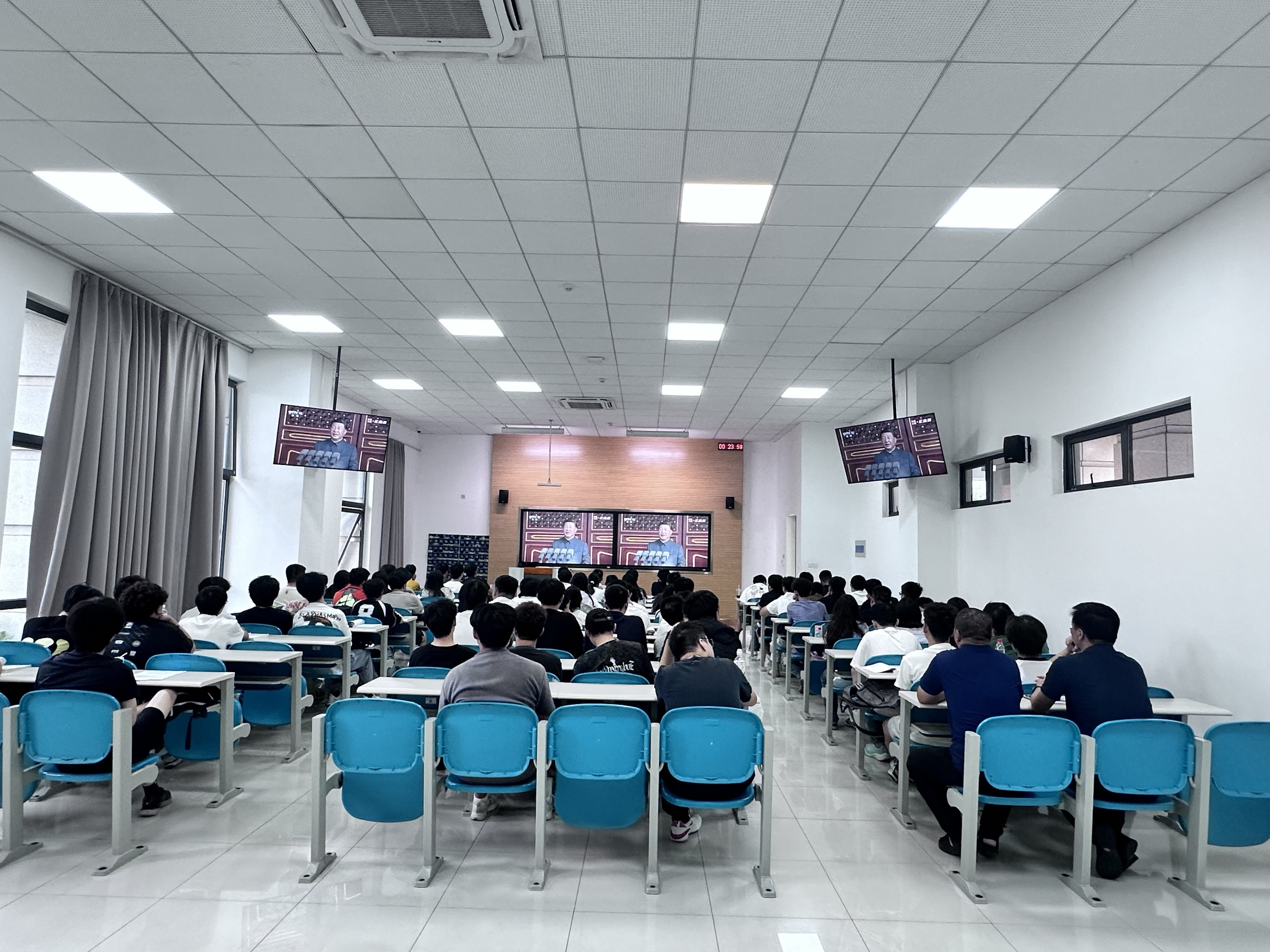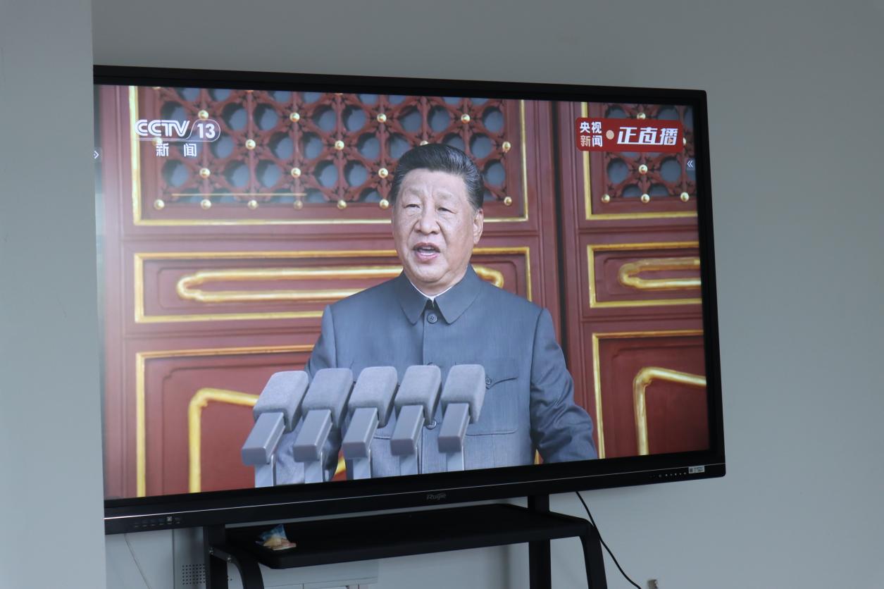 上午 9 时许,阅兵盛典正式开播。学院教学楼多媒体教室、行政办公室、实验室等场所同步开启观看通道:在各专业班级集中观看点,同学们目光聚焦屏幕,当威武的受阅方队迈着铿锵步伐通过检阅台、先进的装备方阵展现大国重器风采时,教室内不时响起热烈掌声;行政办公室内,工作人员暂时放下手头工作,围坐在一起认真观看,大家一边记录精彩瞬间,一边轻声交流对国家发展的感慨;袁丁院长与学院领导班子成员走进学生观看现场,与同学们一同见证盛典,不时为受阅队伍的飒爽英姿点赞,与学生分享对国防科技、智能装备发展的见解,现场氛围庄重而热烈。